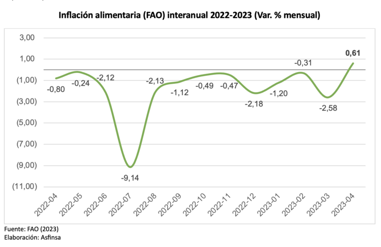 De acuerdo a la cifra más reciente de inflación alimentaria de la FAO, el índice muestra al mes de abril de 2023 su primera alza desde hace un año, con un aumento de 0.61%. Este hecho se debe al incremento significativo en el índice de precios del azúcar y la mejora del índice de precios de la carne. No obstante, los índices de precios de los cereales, productos lácteos y aceites vegetales continuaron disminuyendo.