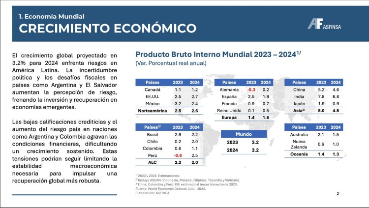 • El crecimiento global proyectado en 3.2 % para el 2024 enfrenta desafíos como el aumento del riesgo país y las bajas calificaciones crediticias en América Latina. Estos factores complican la inversión y limitan la recuperación en economías emergentes, como Argentina y Colombia.