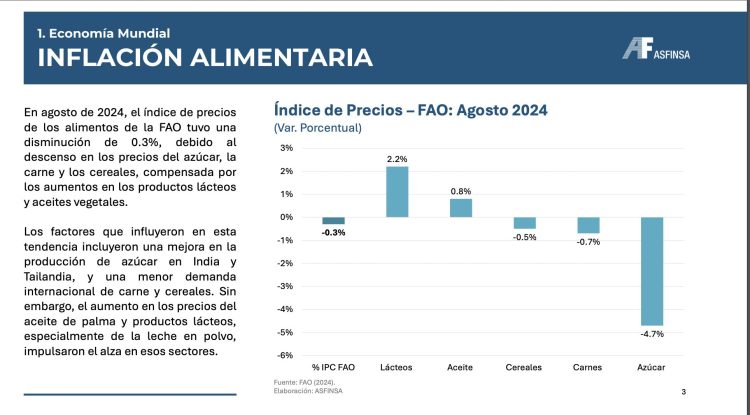 • En agosto de 2024, los precios globales de alimentos cayeron un 0.3%, gracias a la disminución del azúcar y cereales. Sin embargo, el alza de aceites y productos lácteos mantiene la presión en algunos sectores, mostrando una tendencia mixta.
