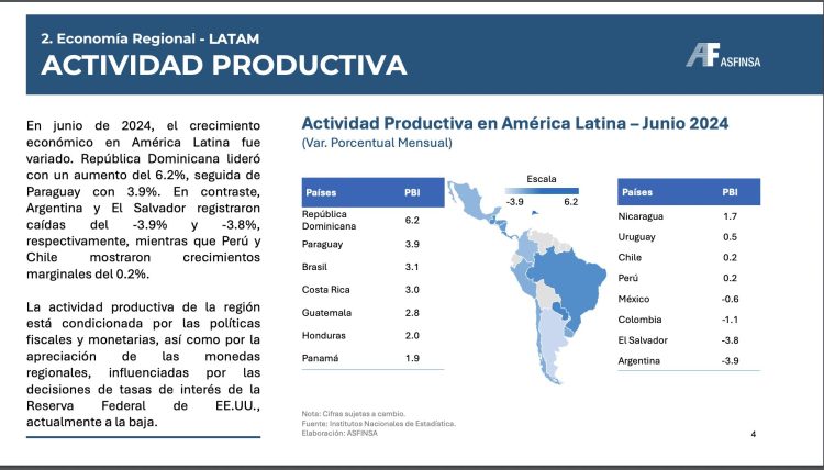 • En junio de 2024, el crecimiento en América Latina fue variado, con República Dominicana liderando con un 6.2% y Argentina disminuyendo un -3.9%. La política fiscal y monetaria, junto a la apreciación de las monedas, son factores claves en la actividad regional.