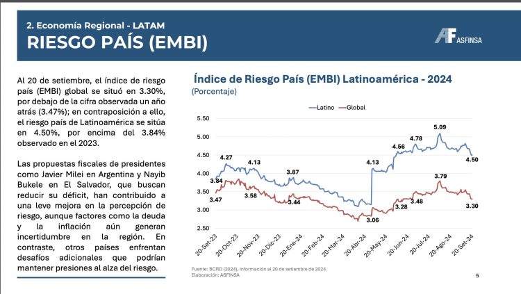 • A setiembre de 2024, el EMBI de América Latina se situó en 4.50%, superando el 3.84% del año anterior. Pese a mejoras en países como Argentina, los problemas de deuda e inflación siguen influyendo negativamente en la región.