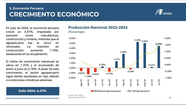 • En julio de 2024, Perú creció 4.47%, impulsado por la manufactura y construcción. Sin embargo, el sector agropecuario disminuyo, y el crecimiento acumulado entre enero y julio fue del 2.78%.