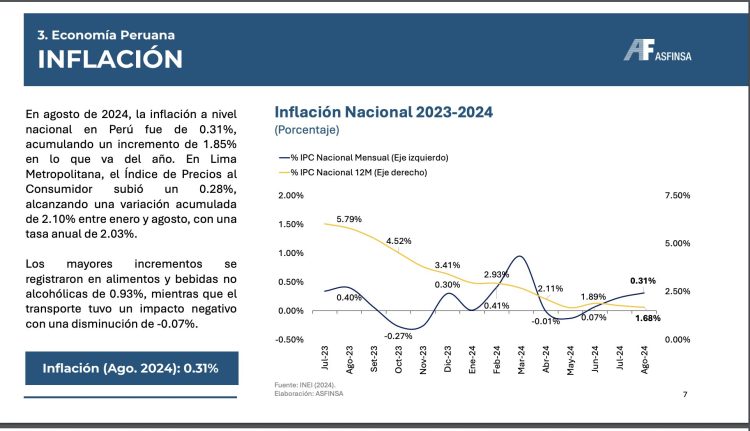 • En agosto de 2024, la inflación nacional aumento un 0.31%, acumulando 1.85% en lo que va del año. En Lima, los precios de alimentos y bebidas no alcohólicas aumentaron 0.93%, mientras el transporte disminuyó en -0.07%.
