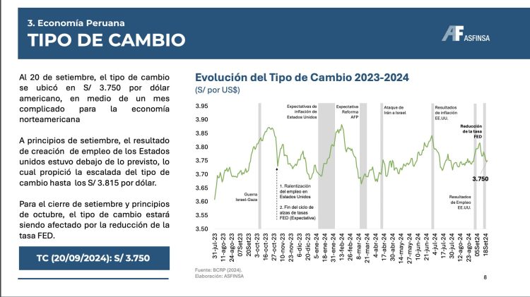 • Al 20 de setiembre de 2024, el tipo de cambio en Perú alcanzó los S/ 3.750 por dólar, influenciado por la desaceleración del empleo en EE.UU. y la reducción de tasas de la FED.