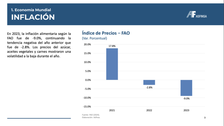 • La inflación alimentaria global, según la FAO, fue de -9.0% en 2023, continuando la tendencia negativa del año 2022. • Al tercer trimestre de 2023, Panamá con 9.0%, Nicaragua con 6.2% y Costa Rica con 5.9% son las economías con el mayor crecimiento de su PBI.