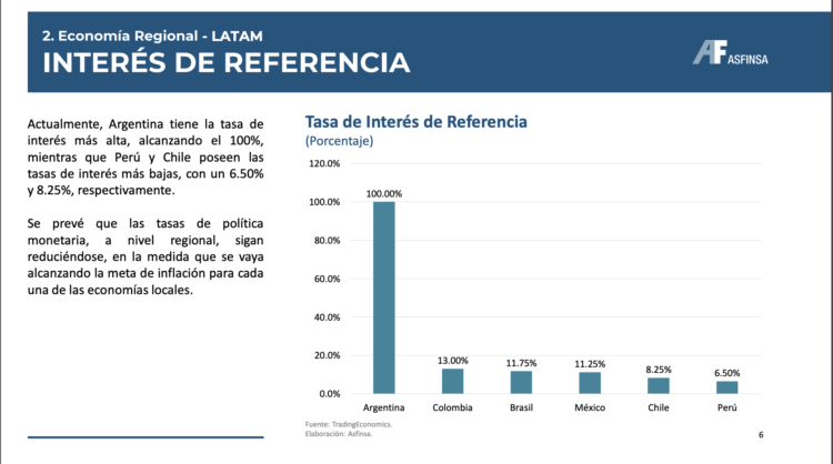• Durante 2023, la inflación más alta se observó en Argentina con 211.4%, Colombia con 9.3% y Uruguay con 5.1% Las economías con la inflación más baja fueron Ecuador con 1.4%, Bolivia con 2.1% y Perú con 3.4%. • Argentina destaca con la tasa de interés más alta del 100%, mientras que Perú y Chile tienen tasas más bajas del 6.50% y 8.25% respectivamente.