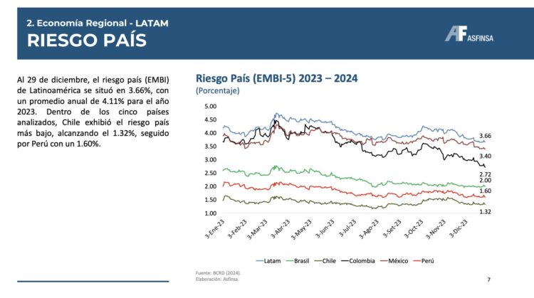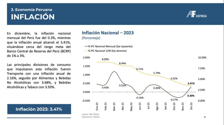 • La inflación de 2023 se ubicó en 3.41% situándose cerca del rango meta del BCRP de entre 1% a 3%.