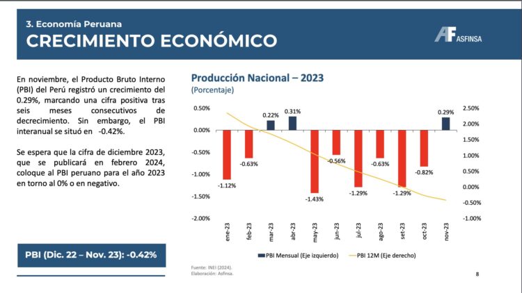 • El PBI de Perú, en noviembre, se ubicó en 0.29%. Esta cifra no fue suficiente para contrarrestar los resultado negativos de meses anteriores. El PBI interanual fue de -0.42%.