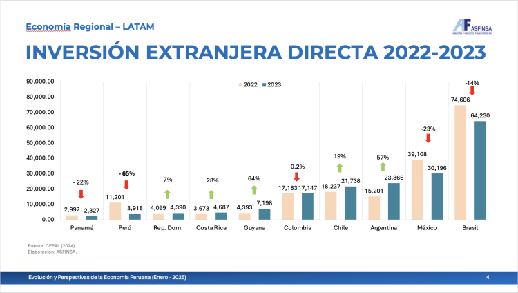 - En el 2023, el mayor flujo de Inversión Extranjera Directa se encuentra en Brasil y México, con US$ 64,230 millones y US$ 30,196 millones, respectivamente. Países como Panamá y Perú son los de menor volumen de IED y que a su vez disminuyeron durante el 2023.