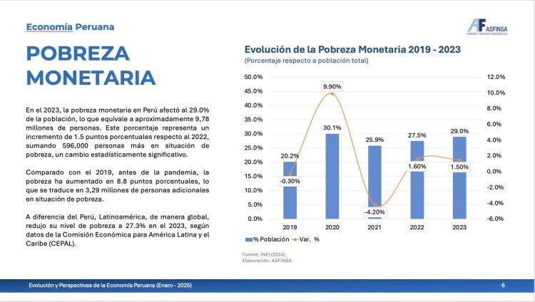 - En el 2023, la pobreza monetaria fue uno de los indicadores más resaltantes, ubicándose en 29%, respecto a la población total. Este incremento de 1.5% respecto del año 2022 muestra uno de los mayores riesgos a gestionar durante este 2025.