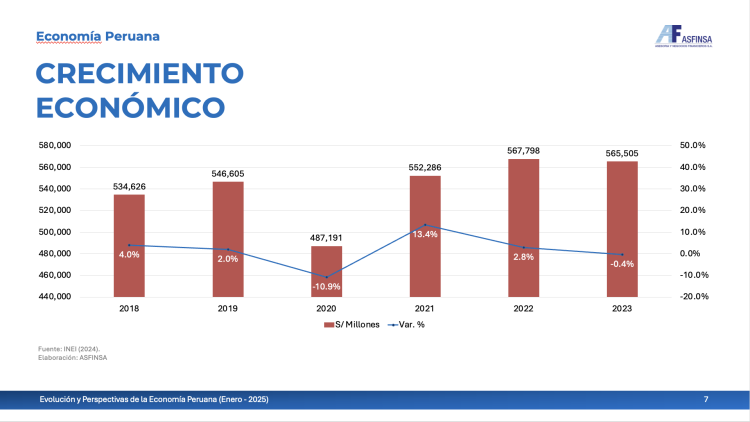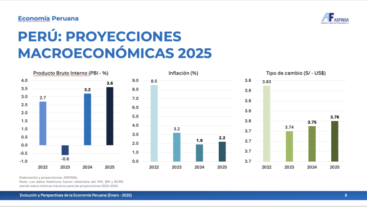 - Para el 2025, se prevé que el crecimiento económico se ubique en 3.6%, la inflación en 2.2% y el tipo de cambio en S/ 3.76 por dólar.