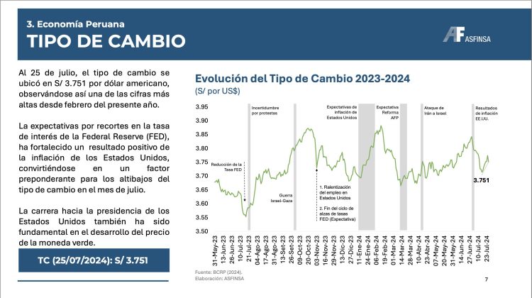 • Al 25 de julio, el tipo de cambio se situó en S/ 3.751 por dólar, una de las cifras más altas desde febrero. Las expectativas de recortes en la tasa de interés de la FED y la inflación positiva en EE.UU. han influido en la fluctuación del tipo de cambio. Además, la carrera presidencial estadounidense ha sido un factor clave en el comportamiento del dólar.