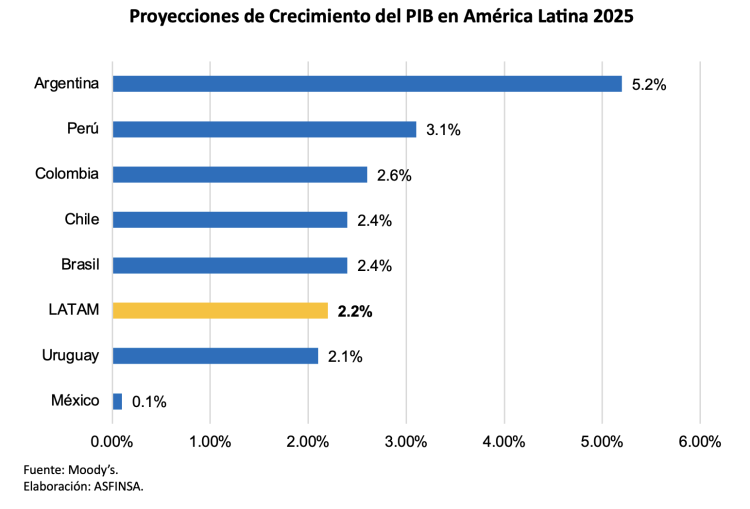 América Latina muestra una recuperación moderada en el 2025, con un crecimiento regional proyectado del 2.2% de acuerdo a Moody’s Analytics, ligeramente por encima de lo previsto en diciembre con un 2.1%. Este repunte es liderado por Argentina con un 5.2% y Perú con 3.1%, seguidos de Colombia con 2.6%, Brasil y Chile con 2.4% cada uno. México, en contraste, se encuentra casi estancado con solo 0.1%. El crecimiento se sustenta en precios altos de los commodities y mejora crediticia en economías clave.