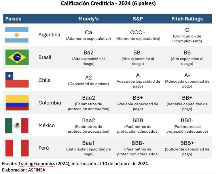 México, Colombia y Perú tienen calificaciones intermedias, lo que les otorga una capacidad de pago adecuada. Sin embargo, su riesgo moderado limita el acceso a las mejores condiciones de financiamiento. Aunque están en mejor posición que Argentina y Brasil, la percepción de riesgo aún afecta la captación de inversiones en algunos sectores.