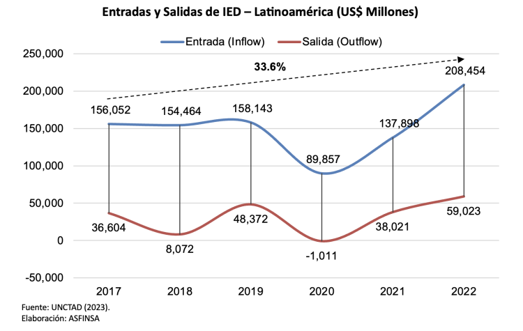 La inversión extranjera directa (IED) en Latinoamérica ha mostrado un crecimiento significativo en los últimos años, alcanzando un resultado neto positivo de US$ 208,454 millones al 2022. Según la UNCTAD, entre 2017 y 2022, el ingreso de IED en la región se incrementó en un 33.6%, lo que refleja el interés y la confianza de los inversores en el potencial de la región.