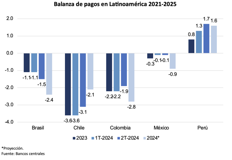 Al cierre del segundo trimestre de 2024, las cuentas corrientes de la mayoría de los países de la región han mejorado. En el caso de Brasil, el déficit aumentó a -1.5% del PBI, proyectándose a un -2.4% para el fin del presente año. Perú, en cambio, alcanzó un superávit del 1.7%, tras revertir un déficit de -4.0% en el 2022, gracias a menores precios de importación.
