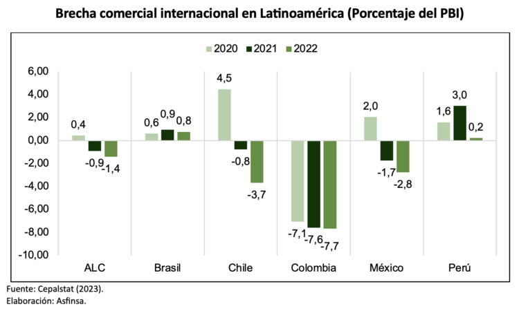 Cabe resaltar el desempeño de Brasil y Perú, quienes han mantenido un superávit en sus indicadores de brecha comercial internacional, con 0.8% y 0.2% en 2022, respectivamente. Mantener un superávit en la brecha comercial es beneficioso para un país; pues indica que está generando más ingresos a través de las exportaciones, contribuyendo al crecimiento económico y a la acumulación de reservas internacionales.