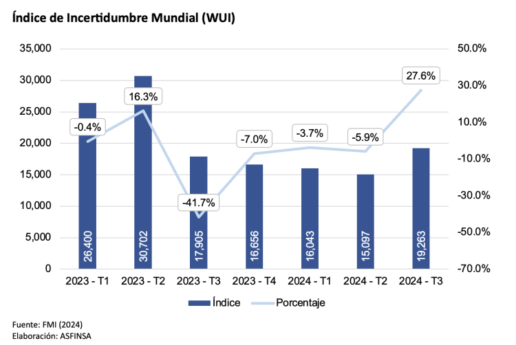 En el 2024, el WUI mostró una tendencia descendente en los dos primeros trimestres: 16,043 puntos en el primero (-3.7%) y 15,097 en el segundo (-5.9%). Sin embargo, el tercer trimestre experimentó un repunte significativo, alcanzando 19,263 puntos, lo que representa un incremento del 27.6%. Estas variaciones denotan una persistente volatilidad en la percepción de incertidumbre a nivel global.