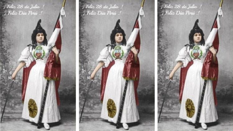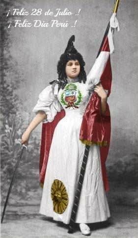 Esta hermosa foto llamada la Madre Patria, fue tomada en el Estudio de Eugène Courret (1865-1925), a fines del siglo XIX, la modelo está vestida con el atuendo que reúne la simbología patria y el Sol de los Incas, una muy bella composición (original en sepia, el color es un trabajo posterior).