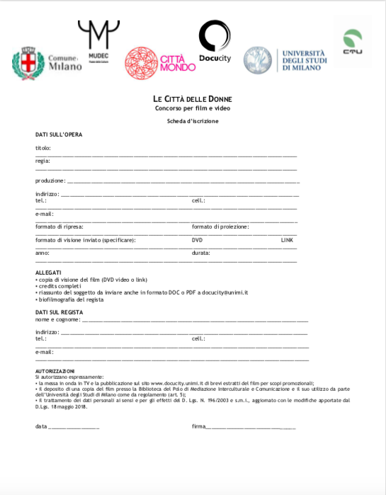 Nell’ambito del progetto “Milano Città Mondo #05”, che ha come tema il ruolo delle donne nelle varie comunità internazionali presenti nella città e nelle culture di cui sono portatrici, il Comune di Milano in collaborazione con Città Mondo, Mudec, Università degli Studi di Milano, Docucity/UNIMI e CTU (Centro per l’innovazione didattica e le tecnologie multimediali dell’Università degli Studi di Milano), promuove il Concorso per film e video “Le città delle donne”.