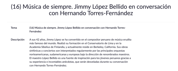 Inicio Culturales Hay Festival: Jimmy López Bellido en conversación con Hernando Torres-Fernández Culturales Hay Festival: Jimmy López Bellido en conversación con Hernando Torres-Fernández Por Redazione - 28 octubre, 2020 0 566 FacebookTwitterPinterestWhatsApp INSCRÍBETE A ESTE EVENTO https://zoom.us/webinar/register/WN_QZ3qF42ERcOwe0xEMNvg1g Artículos relacionadosMás del autor X Edizione Milano Art Week 2026 Hablamos de María Reiche con su Albacea Ana María Cogorno (1) Da Vienna a Roma. Le meraviglie degli Asburgo dal Kunsthistorisches Museum Museo del Corso – Polo museale, Palazzo Cipolla 6 marzo – 5 luglio 2026 También le puede interesar Tres historias que inspiran. Podcast ES Isabel Recavarren - 2 abril, 2026 0 Este podcast es una producción de Panoramical Studio. https://online.fliphtml5.com/cudfg/Tre-historias-que-inspiran/#p=1 Papa Leone: “Davanti alla brutalità umana Gesù s’inginocchia per lavare le... 2 abril, 2026 Acer – AI secolo TravelMate 2026: quattro nuovi modelli in grande... 2 abril, 2026 Panorámica | Pietro Celi. Las Casas del Made in Italy. Podcast... 2 abril, 2026 Panorámica | Milano, Ciudad Creativa. Podcast ES 1 abril, 2026