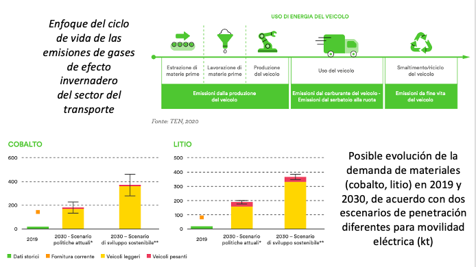 En el escenario del desarrollo sostenible, una mayor difusión de los vehículos eléctricos conduce a más valores de demanda de materiales para 2030 que se duplicó en comparación al escenario basado en las políticas declaradas actuales. Ahora hay muchas estimaciones que plantean el problema y requieren una reflexión adecuada sobre cómo gestionar estas materias primas, tanto en la primera fase de extracción como en la de recuperación / reciclaje, así como proponer nuevas líneas de investigación para baterías eléctricas basadas en menos materias primas vulnerable en comparación con la disponibilidad actual en términos de cantidad y ubicación geográfica en países con alto riesgo geopolítico (Knobloch et al., 2020; Yaghoobnejad y Manthiram, 2020; Xu et al., 2020). Las baterías pueden ser responsables de hasta un tercio de las emisiones de un vehículo eléctrico durante todo su ciclo de vida (IEA, 2020). Esto requiere necesariamente el aumento de la eficiencia energética y el uso de fuentes bajas en carbono en las fases de extracción y refinado de estos materiales, así como en la fabricación y montaje de las propias baterías. Prolongar la vida útil de las baterías y aumentar su capacidad de gestión al final de su vida se vuelve igualmente fundamental para reducir el impacto medioambiental de la movilidad eléctrica, pero estamos hablando de un mercado absolutamente nuevo con poca experiencia, sin embargo, socavado por el bajo costo de las materias primas y el costo de producción de las nuevas baterías que va reduciéndose rápidamente (IEA, 2020).
