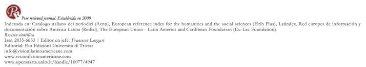 El ensayo debe ser enviado a la dirección: [email protected]. Visioni LatinoAmericane publica obras originales e inéditas en el marco de las ciencias sociales y humanas, con particular desde la sociología, la antropología, la educación, las políticas sociales y el trabajo social. Adopta una perspectiva interdisciplinaria y transdisciplinaria en el estudio de América Latina y el Caribe en sus relaciones con Europa (con Italia en particular) y el resto del mundo. La revista, tal como consta en su declaración de ética editorial, se opone y condena cualquier acción de plagio, falsificación y fabricación de datos, prestando la máxima atención a la calidad científica de los artículos y la verificación de la originalidad, mediante el uso del software Turnetin. Se basa en una doble revisión anónima e internacional. La responsabilidad de lo escrito es exclusivamente del autor y no compromete la Revista y de la Editorial, que puede intervenir para corregir lo erróneamente publicado. Visioni LatinoAmericane es una revista semestral publicada por Eut – Edizioni Università di Trieste (Italia). Participa de las iniciativas del Consejo Europeo de Investigaciones Sociales en América Latina (Ceisal) y Latindex. Es una publicación internacional, de acceso abierto e interdisciplinaria con revisión por pares internacionales doble y anónima.