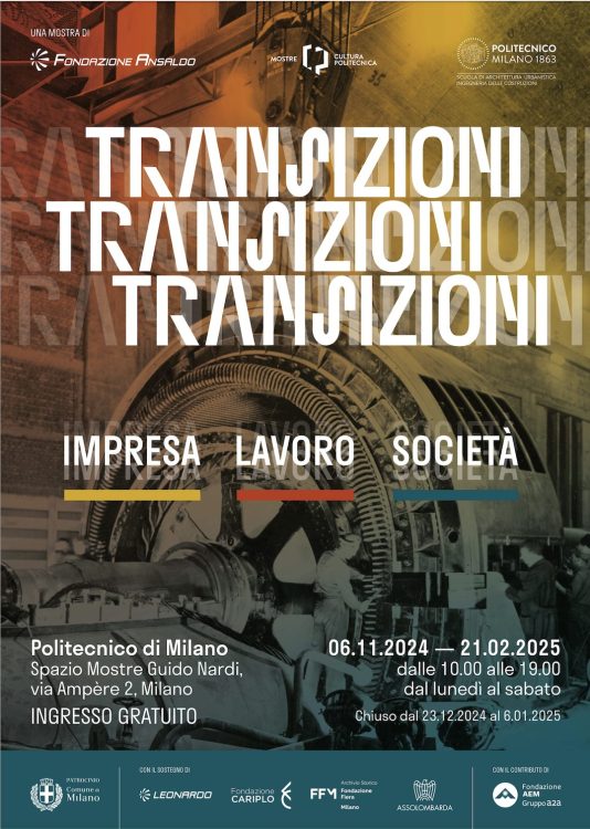 La exposición Transiciones. Negocio – Trabajo – Sociedad, un proyecto diseñado por la Fundación Ansaldo en 2023 y reestructurado centrándose en Milán gracias a la colaboración con la Escuela de Arquitectura, Urbanismo e Ingeniería de la Construcción, estará abierto al público, con entrada gratuita, hasta el 21 de febrero 2025, en las exposiciones del Espacio Guido Nardi del Politécnico de Milán en via Ampère 2, Milán.
