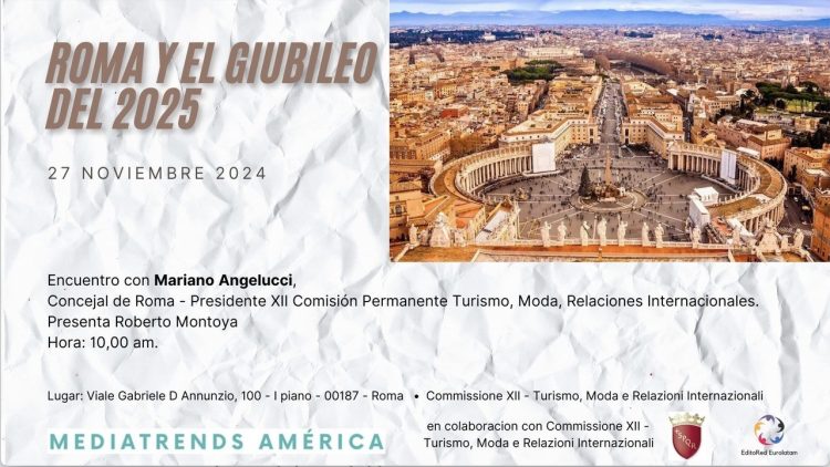 Mediatrends, en colaboracion con la Commissione XII – Turismo, Moda e Relazioni Internazionali del Comune de Roma, le invita al encuentro sobre «Roma y el Giubileo del 2025″ que tendrá lugar el próximo día 27 de noviembre 2024, con Mariano Angelucci, Concejal de Roma, Presidente de la XII Comisión Permanente Turismo, Moda, Relaciones Internacionales. Presentará y moderará la sesión Roberto Montoya, RAI News.