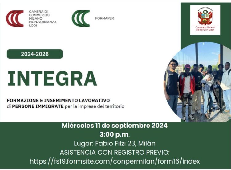 Invitacion del Consulado General del Perú en Milán. Formación Laboral. Miércoles 11/IX – 15h00 a cargo de la organización INTEGRA.