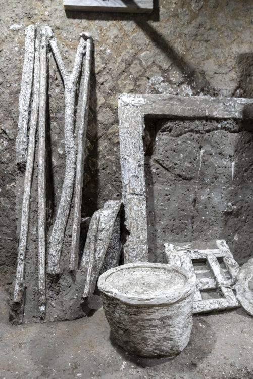 madera se descompuso, dejando un vacío en el suelo. Estos huecos se pueden rellenar con yeso durante la excavación, para recuperar la forma original de la impresión «negativa». Una técnica que dio resultados extraordinarios en la villa de Civita Giuliana, desde los moldes de dos víctimas y un caballo hasta los de las modestas camas del barrio servil.