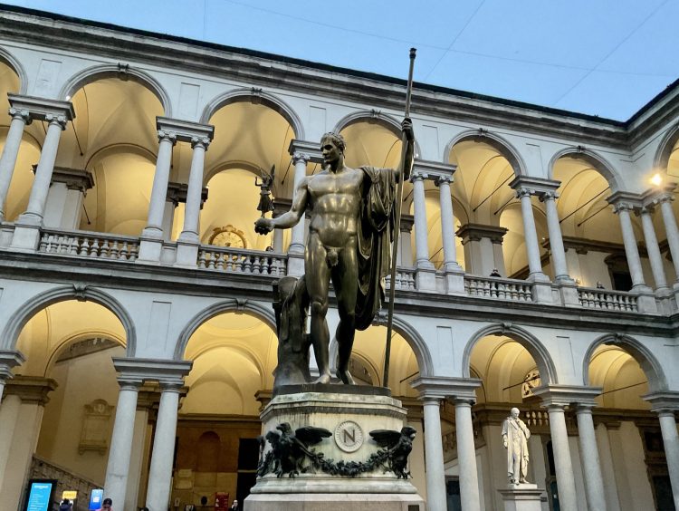 No creo que haya una sede más austera, capaz de inspirar al mismo tiempo seriedad y formalidad, que el Palazzo di Brera. El antiguo complejo medieval pasó a ser convento de los jesuitas y fue reorganizado como colegio y centro de estudios. En ese contexto se construyó el gran cortile/patio, con doble orden de columnas —estilo dórico abajo, estilo jónico arriba—, proyectado por Francesco Maria Richini, uno de los grandes arquitectos del barroco lombardo. Ese conjunto de galerías y corredores columnados constituye el núcleo de lo que hoy se reconoce como el loggiato de Brera.