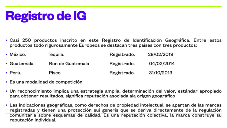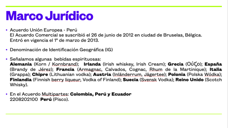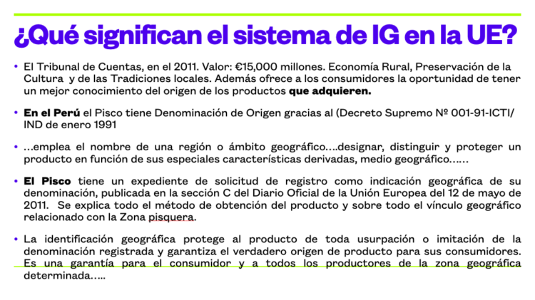 Una grata entrevista realizada por Cesibell Sanchez, experta de Pisco. Fue la oportunidad de repasar el marco jurídico y la importante denominación obtenida por el Perú de la Unión Europea, la Indicación Geográfica, junto con el Tequila de México y el Rum de Guatemala.