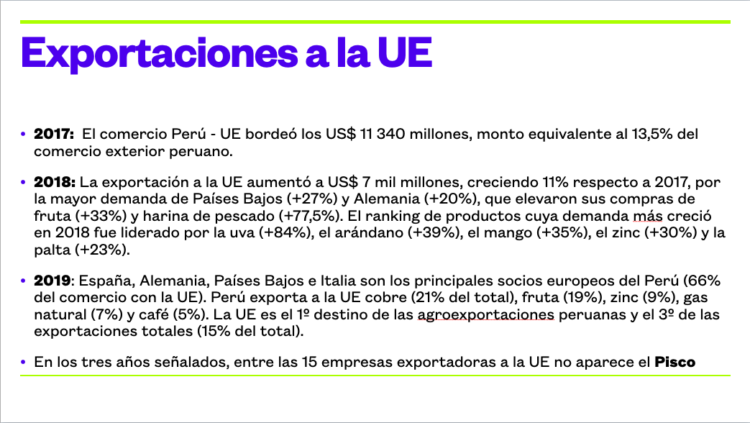 No obstante el esfuerzo realizado, los números que aparecen en los últimos tres años 2017, 2018 y 2019 no denotan una gran exportación del Pisco. Es más entre las primeras quince empresas exportadoras no aparece una que exporte el producto bandera.