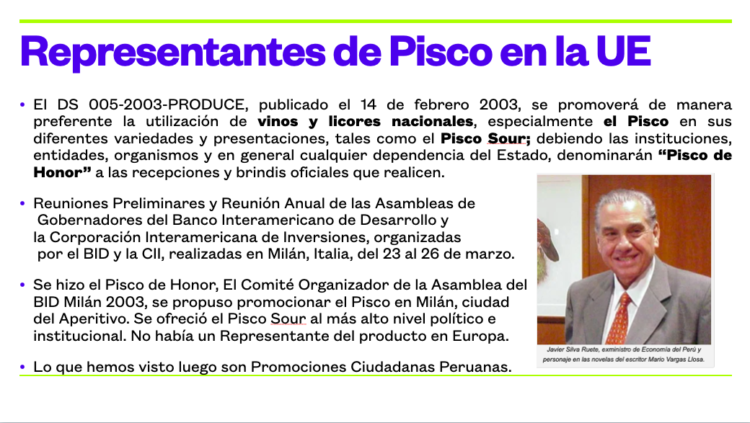 Tuve el privilegio de trabajar en la acción que la Región Lombardia y el Gobierno central italiano realizaron hacia América Latina. Puedo dar testimonio de la acción realizada, en especial en Italia el 2003, por el Ministro Silva Ruete en su veste de Gobernador en el Banco Interamericano de Desarrollo. Milán sede de la Asamblea Anual 2003 tuvo como invitados especiales al Presidente Toledo y sobre todo al Ministro Silva Ruete, quien llegó acompañado de cajas de Pisco, fueron preparados y ofrecidos nuestro Pisco Sour, en los momentos más relevantes, a los representantes de la Asamblea del BID, a políticos europeos, a representantes de la Unión Europea. Su target era alto y de prestigio.