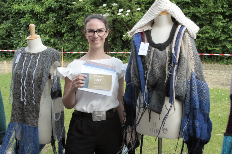 Quant à l’étudiante Louise Le Loch, de l’école de Rennes, elle a présenté un boléro dans des tons bleus avec des accents de gris et de blanc qui montrait diverses techniques de tissage qui formaient un paysage onirique grâce à une texture envoûtante.