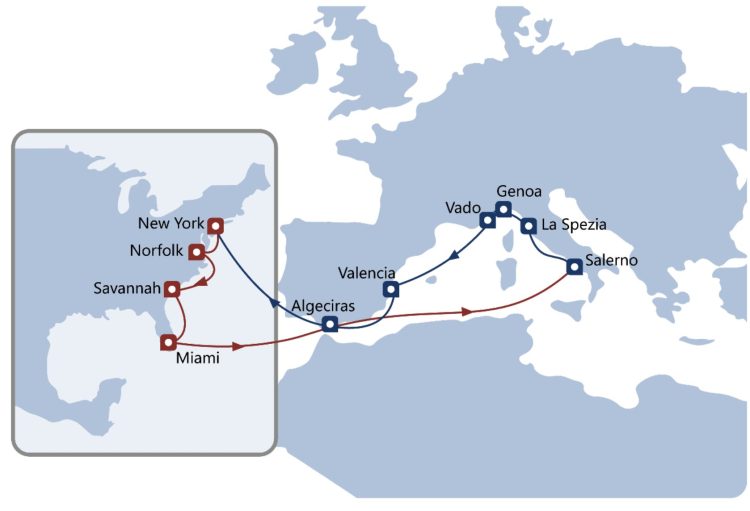 Salerno → La Spezia → Génova → Vado Ligure → Valencia → Algeciras → Nueva York → Norfolk → Savannah → Miami → Algeciras → Salerno