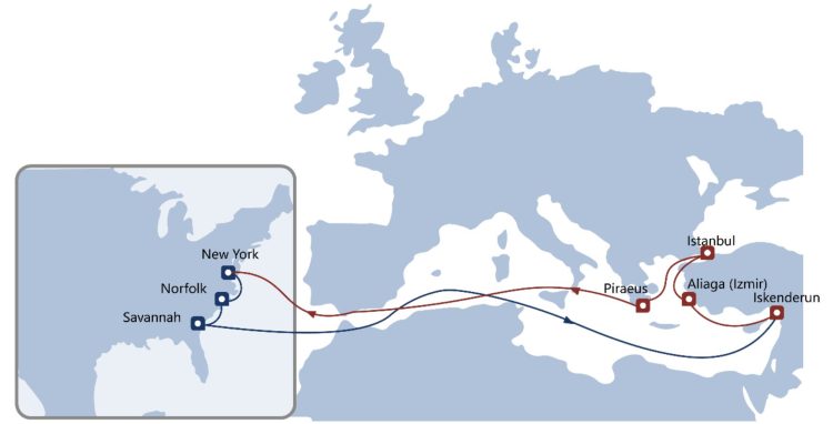 EMA – East Mediterranean to Atlantic East Coast Service Iskenderun → Aliaga → Istanbul → Piraeus → New York → Norfolk → Savannah → Iskenderun