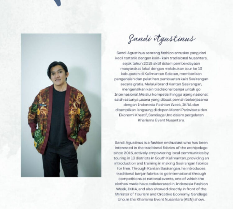 Sandi Agustinus es un entusiasta de la moda que ha estado interesado en los tejidos tradicionales del archipiélago desde 2015. Empodera activamente a las comunidades locales recorriendo 13 distritos del sur de Borneo ofreciendo presentaciones y capacitación gratuitas en la confección de tejidos Sasirangan. A través de Kantan Sasirangan, introdujo las telas tradicionales Banjar en el escenario internacional a través de concursos en eventos nacionales. Una de las prendas confeccionadas en colaboración se presentó en la Semana de la Moda de Indonesia, IKRA, y también se mostró directamente frente al Ministro de Turismo y Economía Creativa, Sandiaga Uno, en el desfile Kharisma EVENT Nusantara (KEN).