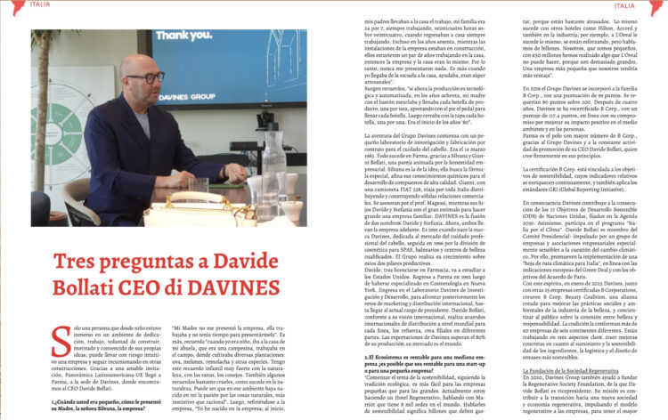 Davines Group, una empresa italiana con sede en Parma activa en el sector de la cosmética profesional con las marcas Davines para el cuidado del cabello y [zona de confort] para el cuidado de la piel, anuncia que cerró 2022 nuevamente al alza: una facturación de 230,6 millones de euros, un 20,4% más en comparación con 2021.