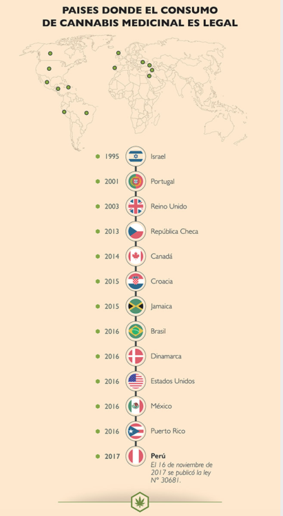 11 octubre 2017: La Comisión de Salud y Población del Congreso del Perú aprobó el proyecto de ley N° 982/2016 – PE sobre el uso de la marihuana o cannabis con fines medicinales. Unos días después, el 20, el congreso aprobó por mayoría la norma.