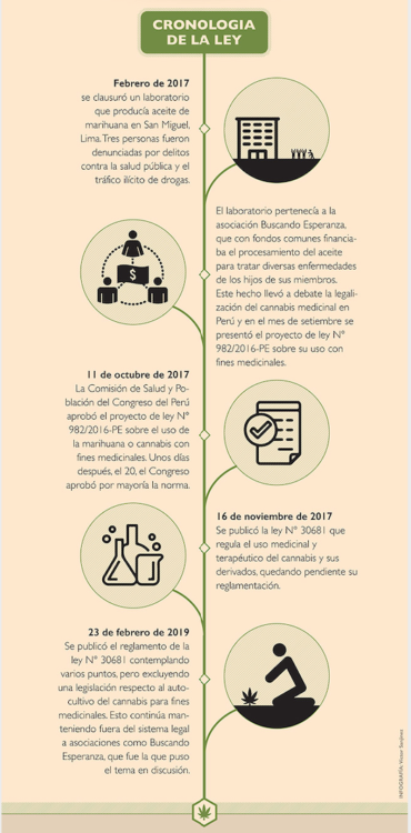 23 de febrero de 2019: Se publicó el reglamento de la ley N° 30681 contemplando varios puntos, pero excluyendo una legislación respecto al autocultivo del cannabis para fines medicinales. Esto continúa manteniendo fuera del sistema legal a asociaciones como Buscando Esperanza, que fue la que puso el tema en discusión.