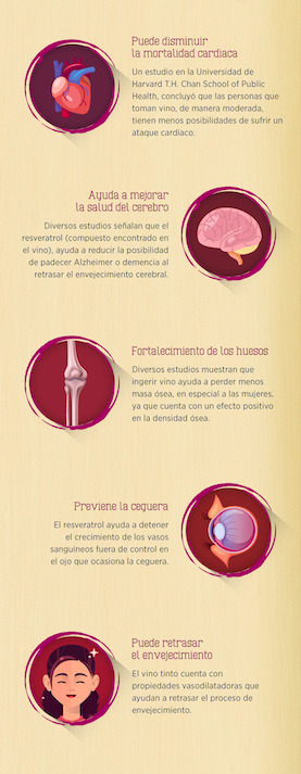 Diversos estudios señalan que el resveratrol (compuesto encontrado en el vino), ayuda a reducir la posibilidad de padecer Alzheimer o demencia al retrasar el envejecimiento cerebral.