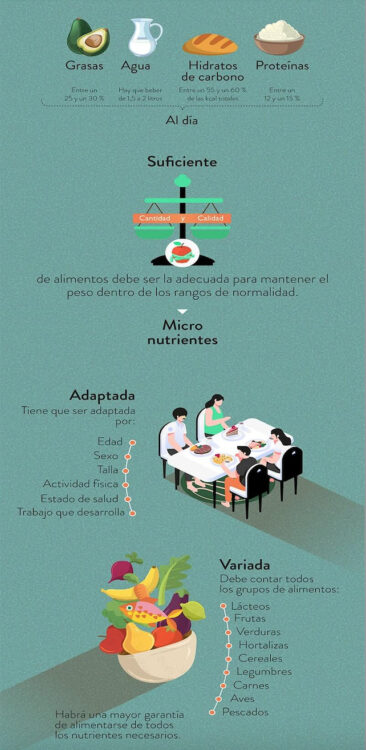 - Equilibrada: Los nutrientes deben estar repartidos guardando una proporción entre sí.