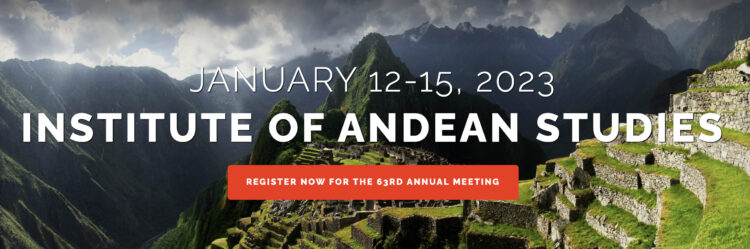 El Institute of Andean Studies anuncia su virtual 63ª Reunión Anual, los partes en vivo de la cual se celebrará virtualmente en línea del jueves al domingo, del 12 al 15 de enero de 2023. Las presentaciones en video, los carteles y los foros de discusión escrita estarán disponibles continuamente desde el 2 de enero hasta el 11 de febrero de 2023. Los miembros, no miembros y estudiantes son bienvenidos a participar y proponer ponencias y carteles en inglés o castellano. Investigadores que viven y generalmente están empleados en Sudamérica son alentados a solicitar Premios de Ponencia monetarias cuando presenten sus propuestas de ponencia. Todas las propuestas deben presentarse hasta el miércoles, 31 de octubre de 2022. Los detalles están a continuación.