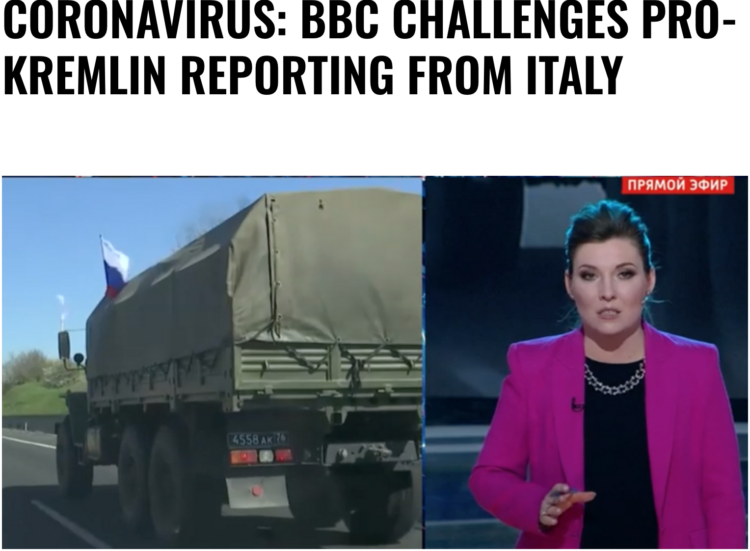 • La Unión europea ha detectado una serie de noticias falsas alrededor de la pandemia, con la llegada de la ayuda rusa a Italia, la televisión rusa Rossiyskaya Gazeta transmitió el ingreso de los camiones con la ayuda y los 30 médicos rusos. La televisión informó que Italia había sustituido la bandera de la unión europea con la bandera rusa y que los italianos habían entonado el himno nacional ruso. Esta noticia motivo una investigación. Se determinó que no era una noticia falsa sino una “verdad híbrida” desde el momento que las banderas fueron flameadas y el himno fue entonado por los socios comerciales de Rusia. La Unión europea sigue con atención las acciones de interferencia de parte de Rusia en su territorio.
