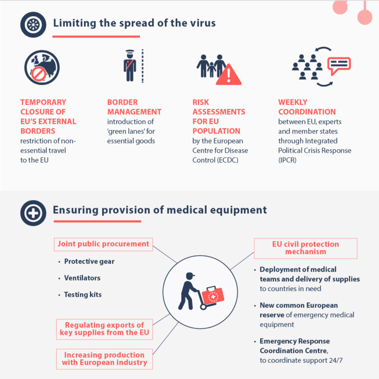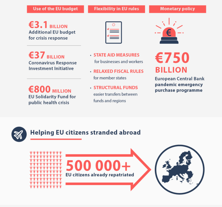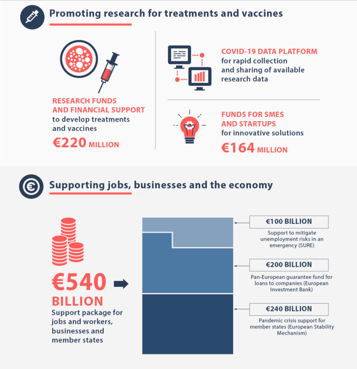 Con el pasar de los días dejará de llamarse «Plan Marshall» para llamarse «Plan De Gasperi», un día antes de celebrar el día de Europa, el 8 de mayo, Mario Centeno, el presidente del Eurogrupo, comunicó haber logrado un acuerdo que entrará en función el 1º de junio y tendrá tres redes de seguridad, para trabajadores, para empresas y para los Estados, para este último se está perfeccionando el Pandemic Crisis Support.