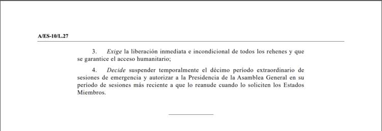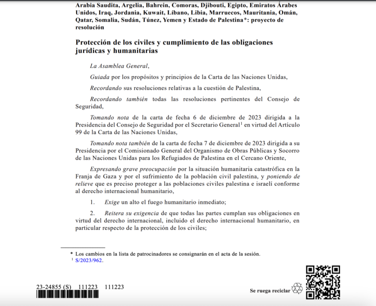 La Asamblea General de la ONU adopta una resolución sobre Oriente Medio exigiendo un alto el fuego humanitario, la protección de los civiles, la liberación inmediata e incondicional de todos los rehenes y el acceso humanitario.