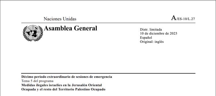 La Asamblea aprobó la resolución titulada “Protección de los civiles y cumplimiento de las obligaciones jurídicas y humanitarias” (documento A/ES-10/L.27) en votación registrada de 153 votos a favor y 10 en contra (Austria, República Checa, Guatemala, Israel, Liberia, Estados Federados de Micronesia, Nauru, Papua Nueva Guinea, Paraguay, Estados Unidos), con 23 abstenciones, durante la reanudación de su décima Sesión Especial de Emergencia sobre las acciones ilegales israelíes en la Jerusalén Oriental ocupada y el resto del Territorio Palestino Ocupado.