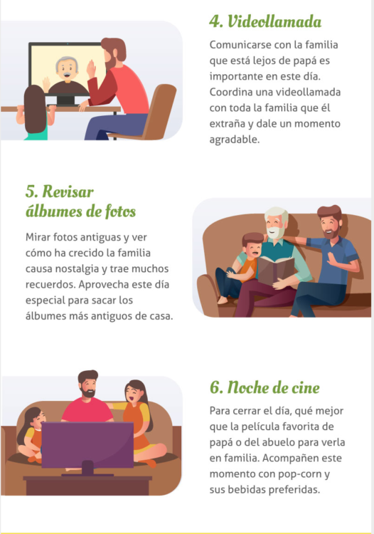6. Noche de cine: Para cerrar el día, qué mejor que la película favorita de papá o del abuelo para verla en familia. Acompañen este momento con pop-corn y sus bebidas preferidas.